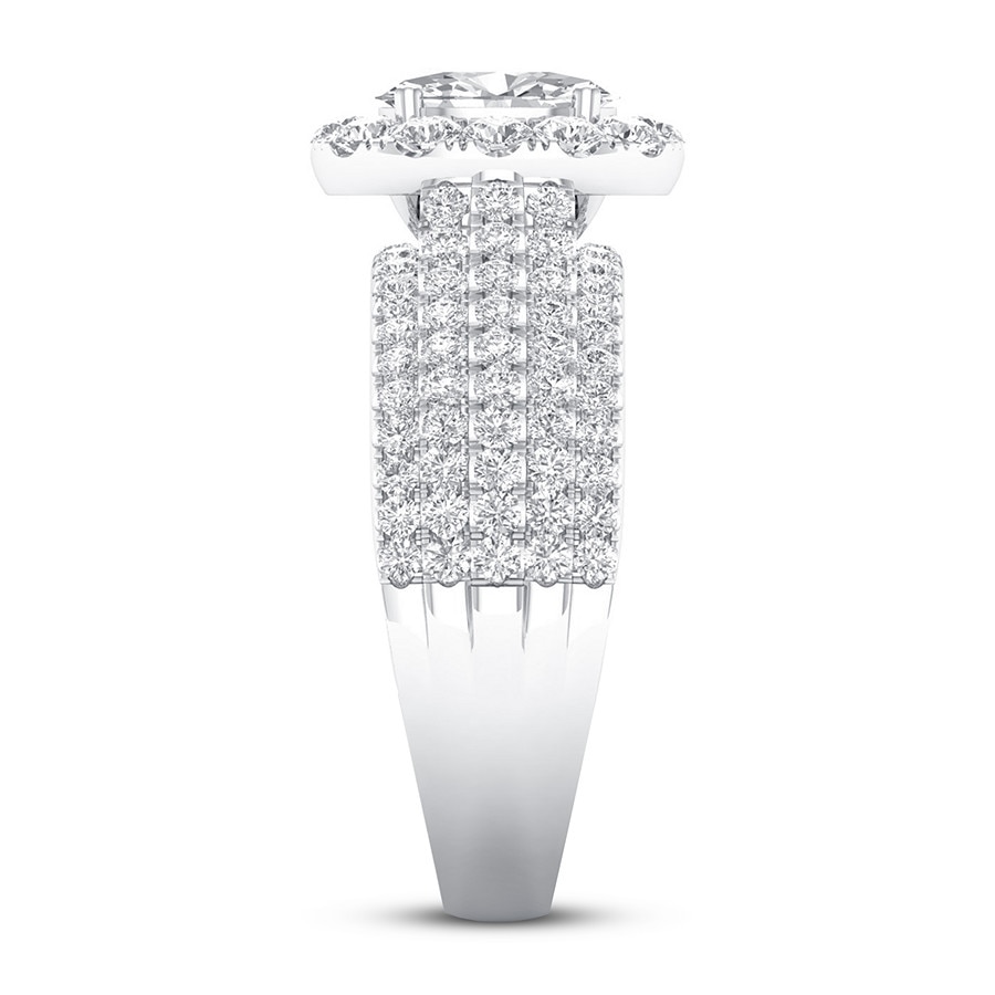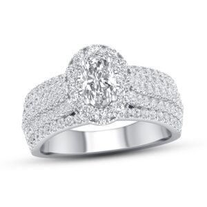This thrilling engagement ring captures your love with independently certified diamonds. A 1/2-carat oval diamond shines at the center, while brilliant round diamonds create a halo and enhance the generous 14K white gold band. The ring has a total diamond weight of 1-3/8 carats, and the center stone is laser-inscribed with a unique serial number.