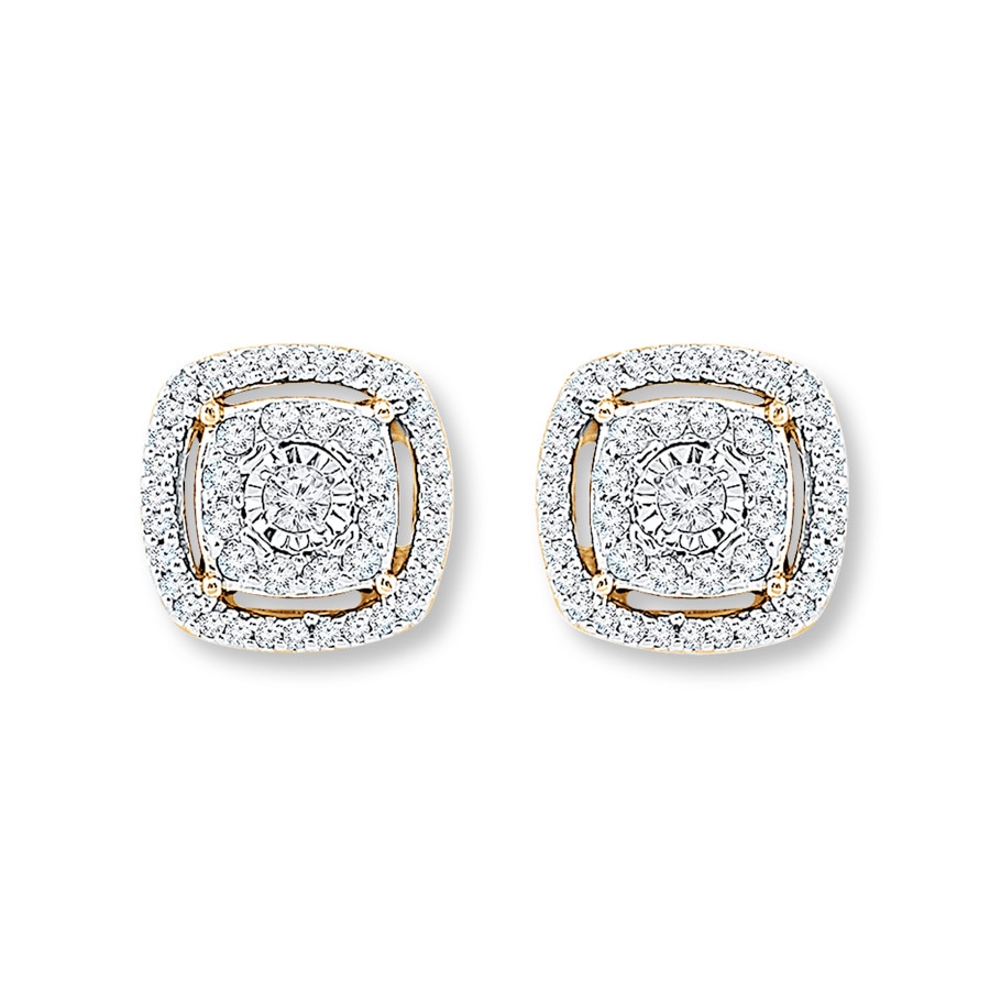 A round diamond is surrounded by cushion-shaped halos of additional round diamonds in these elegant earrings for her. Crafted of 10K yellow gold, a swirling design in the profiles completes the look. The earrings have a total diamond weight of 1/4 carat and secure with friction backs.